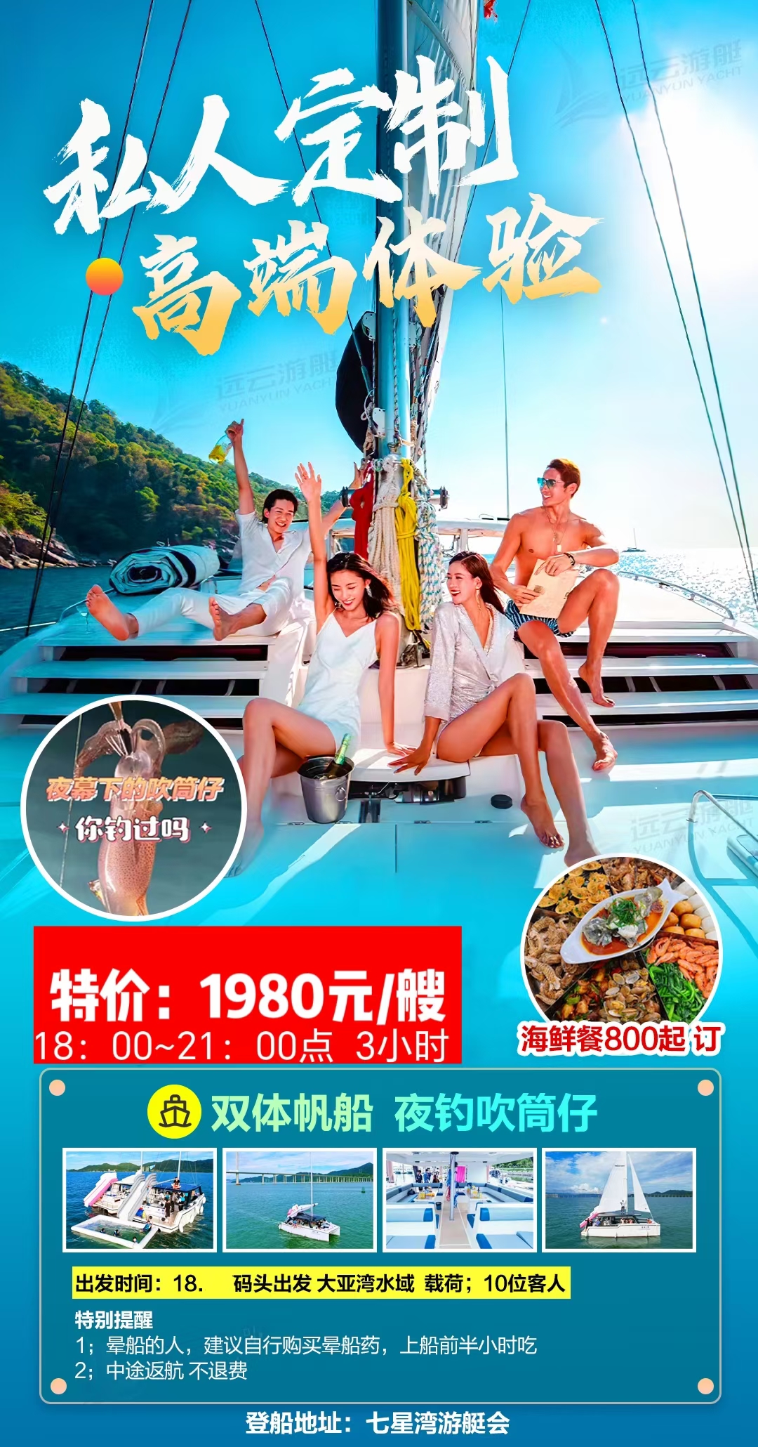 每天下午18:00游艇会码头集合。小吴:17688974649,要提前预定才可以安排出海