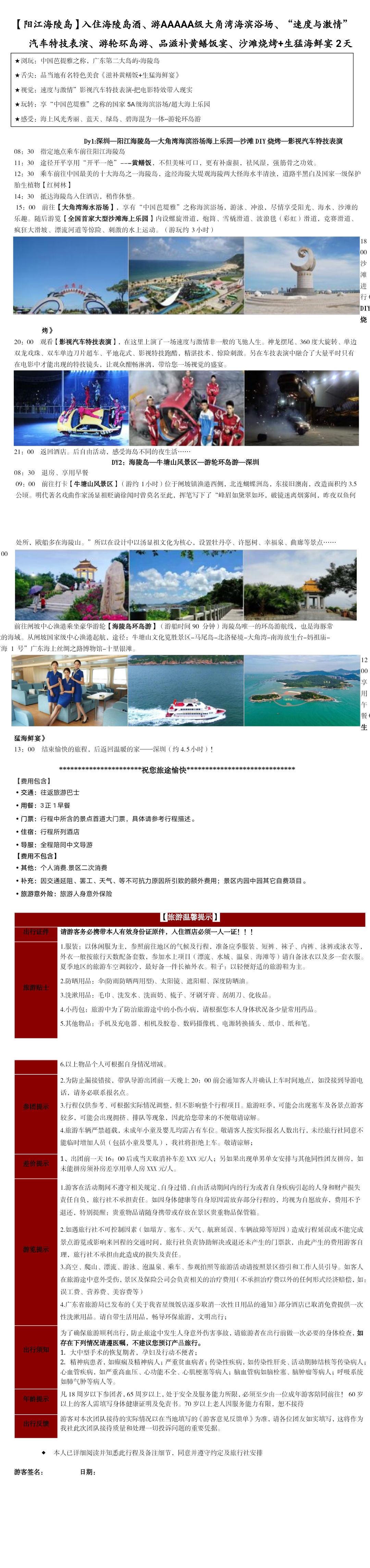 阳江海陵岛入住海陵岛酒、游AAAAA级大角湾海滨浴场、 “速度与激情’ 汽车特技表演、游轮环岛游、品滋补黄鳝饭宴、沙滩烧 [复制链接]