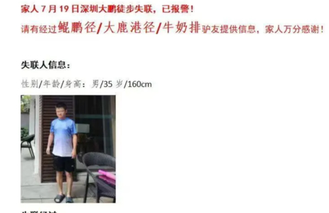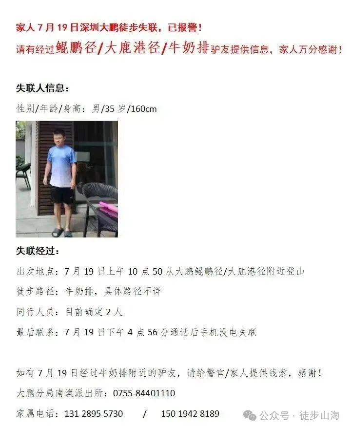 大鹏分局南澳派出所公开联系方式(0755-84401110),呼吁知情者联系警方。同时,警方提醒户外爱好者:“牛奶排属于未开发区域,禁止擅自进入。