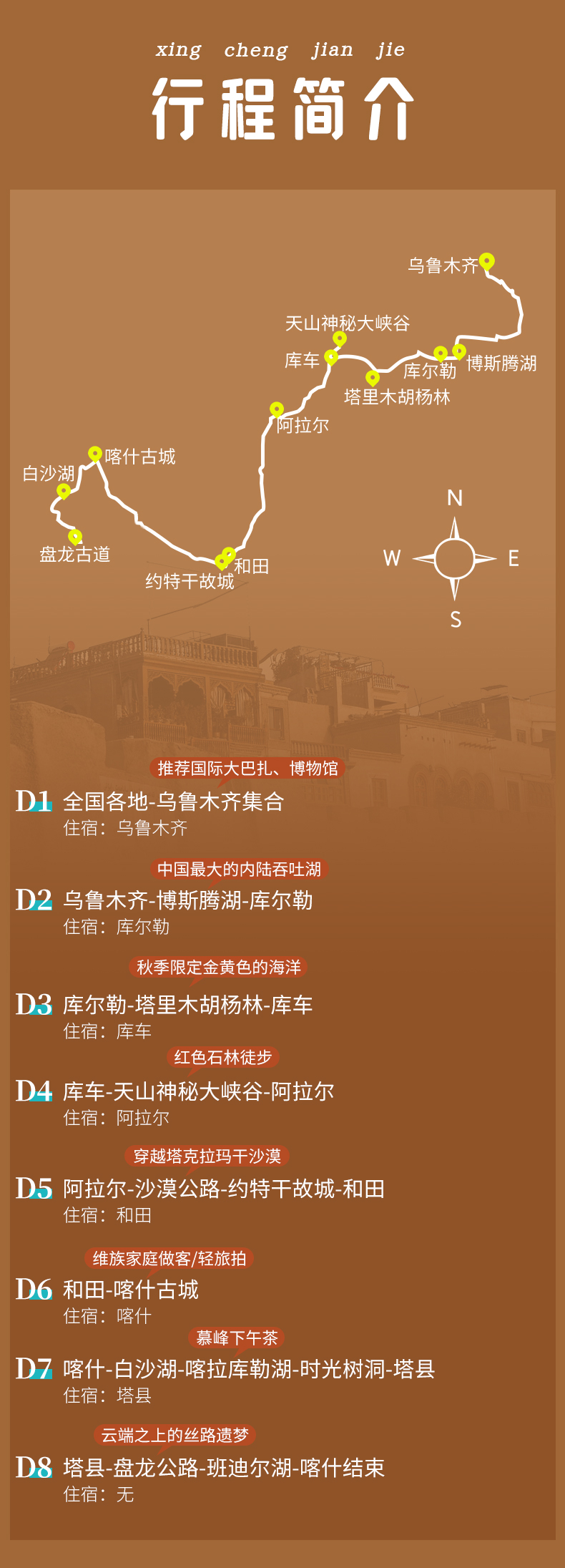 【活动线路】:乌鲁木齐,库尔勒,库车,阿拉尔,和田,喀什,塔什库尔干;