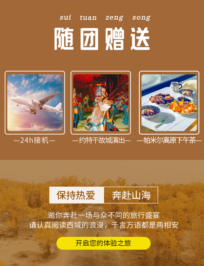 1.2米以下为儿童,含车位费、赠送项目、保险、免门票、免早餐,不含酒店住宿,超高但未满12周岁需补门票300元+早餐费210元,如需占床补1700元床位费。 用车安排:2-3客人用5座SUV,4-5客人用7座商务车,6客人用9改7商务车,7-9客人用15座商务车(小团副驾驶及前后座位需要轮流乘坐,望悉知);10-12人用19座中巴车,13-19人用33座大巴车,20-28人用38座大巴车; 领队安排:单车11人以下司机兼管家(司机兼管家,帮助大家购买门票,给团友游玩建议,无法进入景区和提供专业讲解等服务,敬请谅解);单车12人及以上安排领队+无人机航拍服务。 |