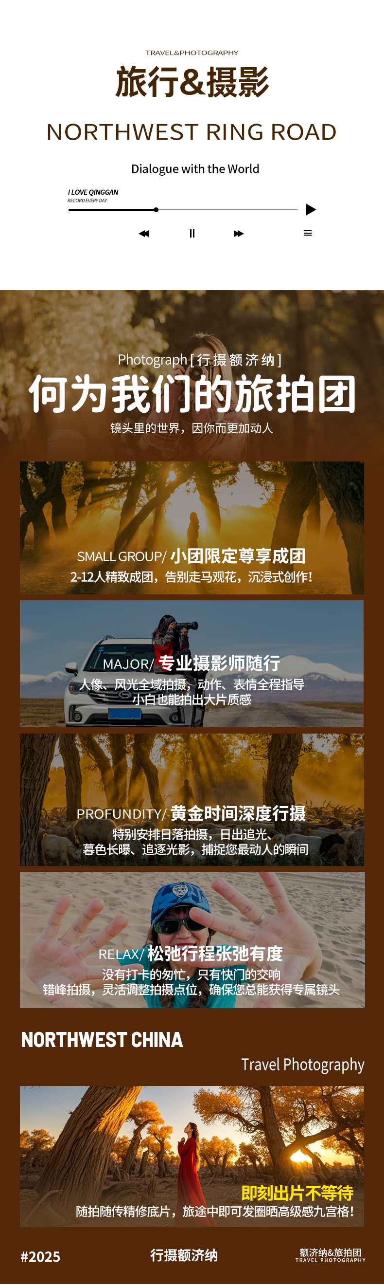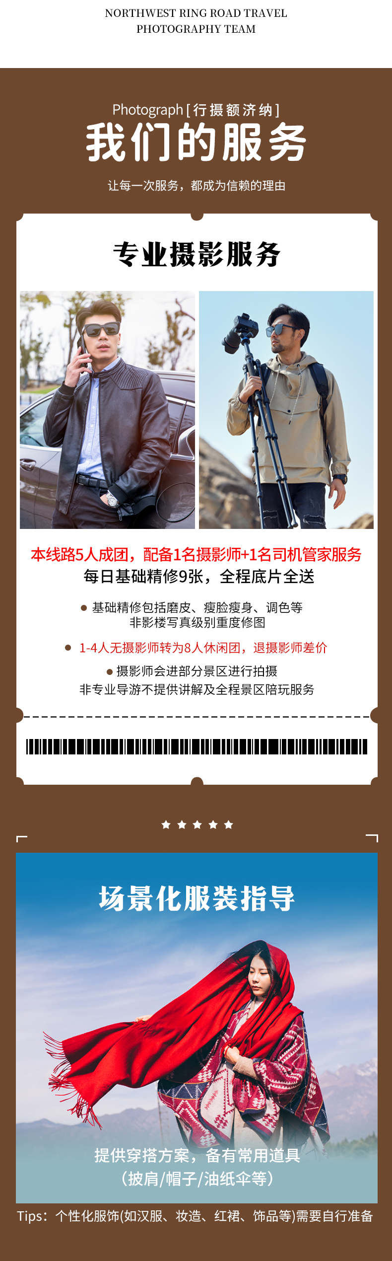 摄影师:当期满5人安排1名摄影师全程单反摄影,不足人数不安排;为保证每位客人的照片张数及质量,摄影师会进部分景区进行拍摄,非专业导游不提供讲解及全程景区陪玩服务,望悉知。