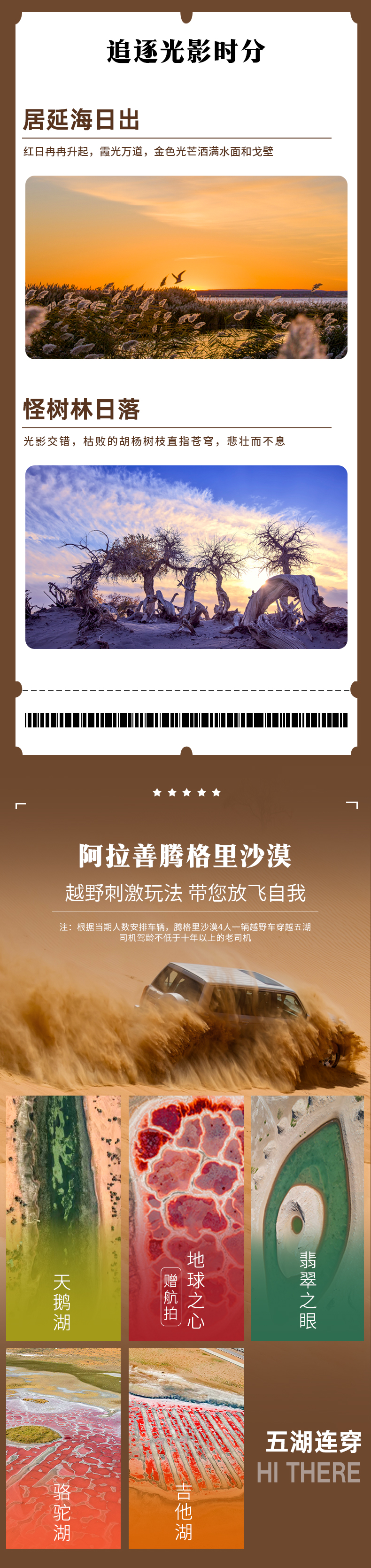 4、门票:天梯山石窟、弱水金沙湾(包含黑水城、怪树林)、额济纳胡杨林+景交车、居延海、天鹅湖、乌兰湖;