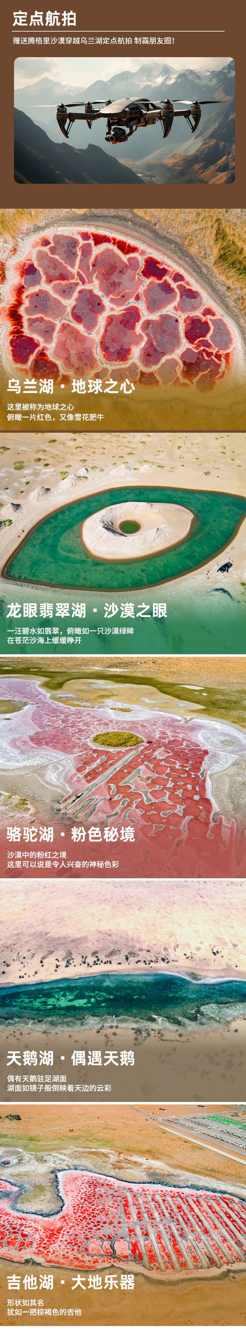 08:00早餐后换乘越野车前往【腾格里沙漠越野穿越五湖】,同时赠送【乌兰湖定点航拍】,体验沙漠越野冲浪的激情体验。
