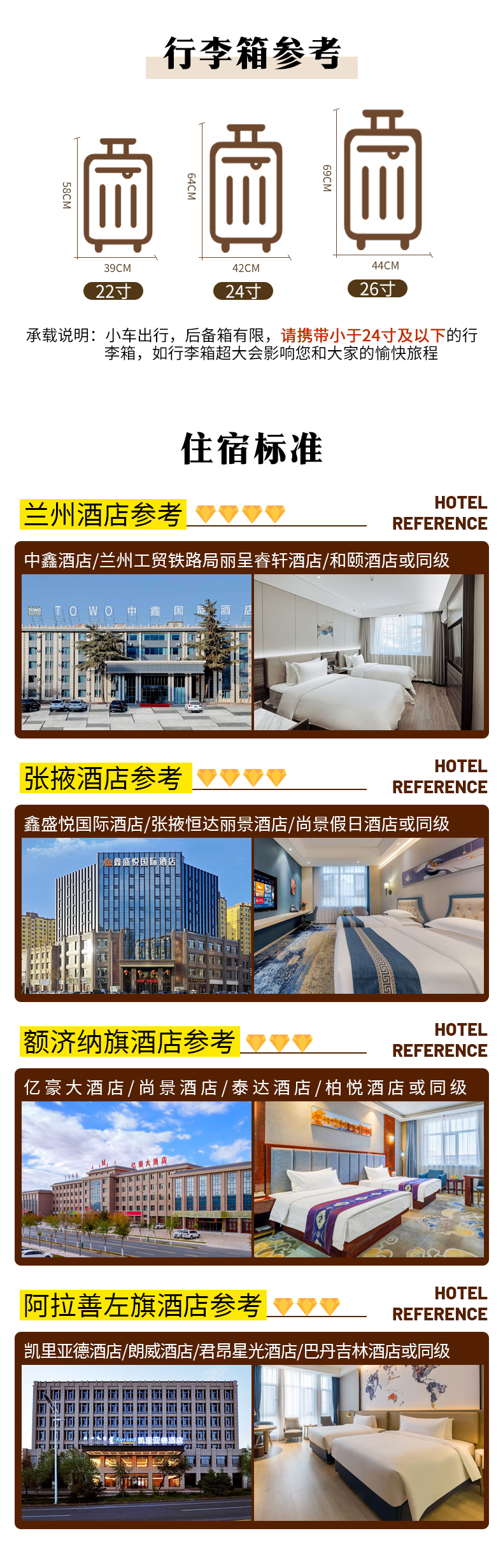 1、住宿:兰州4钻/星酒店标间1晚、张掖市4钻酒店标间1晚、额济纳旗3钻酒店标间2晚、阿拉善左旗3钻酒店标间1晚;