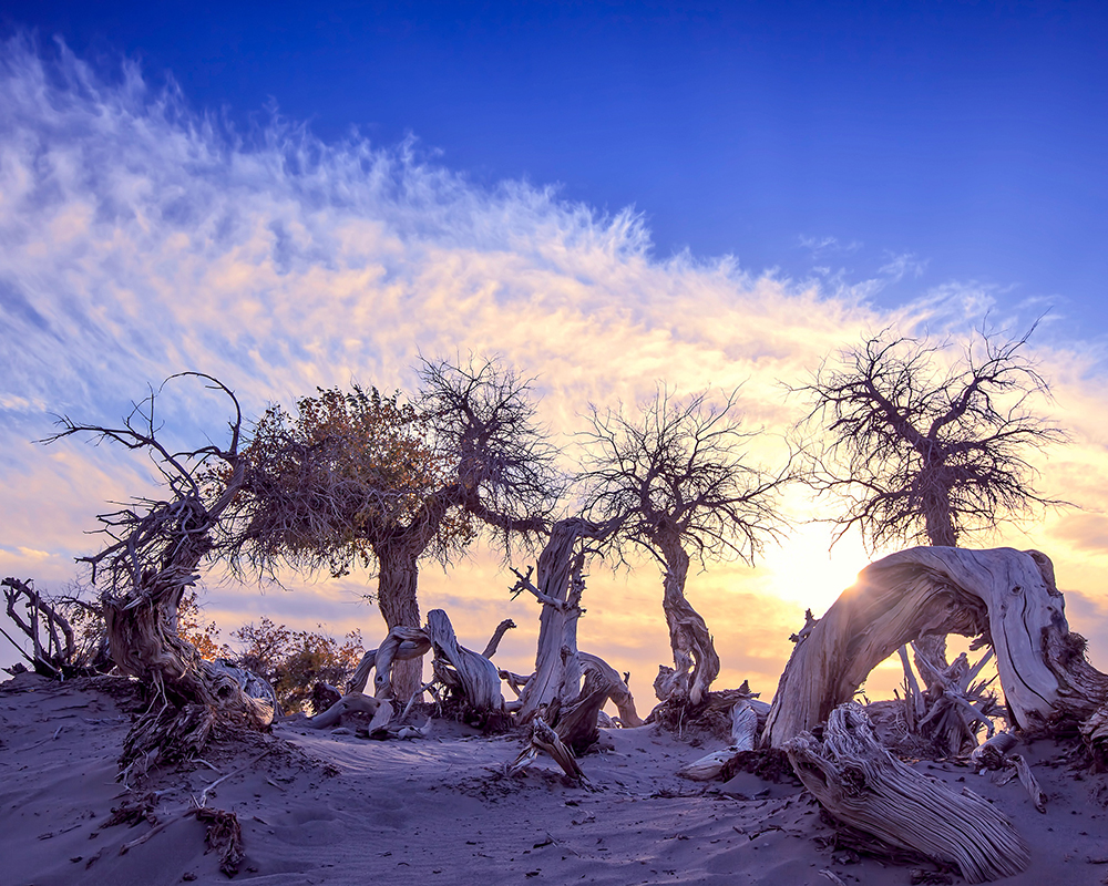 18:30抵达【怪树林欣赏日落】,胡杨号称千年不死,死了千年不倒,倒了千年不朽,堪称生命奇迹。而这里正是大片枯死不朽的胡杨之地;茂密的胡杨千奇百怪,神态万般,有的似人似物,形态各异,不禁令人赞叹大自然之神奇。我们到来之时,正是光线柔和日落之际,光线与胡杨剪影的结合。美不胜收。