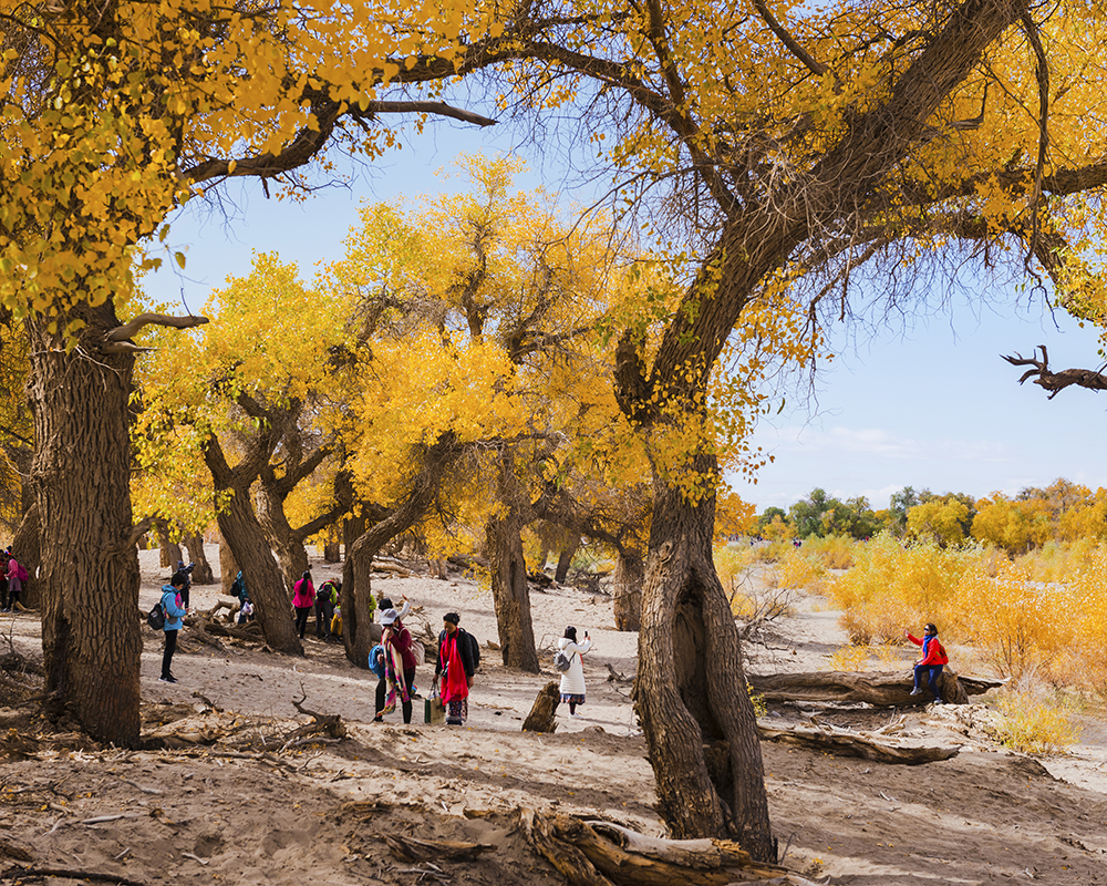 黄叶叶子变黄、与气温、温度、湿度、树龄等都有关系。一般来说,最低气温降至5度左右时开始有黄叶,水分少的区域先黄、树龄少的叶子先黄。根据往年经验,每年9月10日左右开始有局部的黄叶,每年的9月20号左右正是胡杨叶转红的时间,10月初至中旬,胡杨叶子黄得最亮丽,林子多数都是黄的,要求几十万亩的林子完全变黄基本不可能的哦。如果天气稳定,黄叶可以持续到10月中下旬,如果寒流频繁,就会提前落叶,敬请谅解。