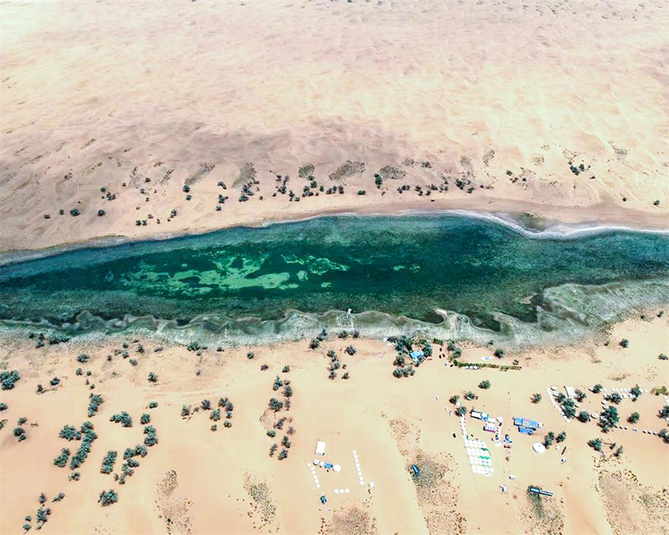沙漠之眼:一汪碧水如翡翠,俯瞰如一只沙漠绿眸在苍茫沙海上缓缓睁开。