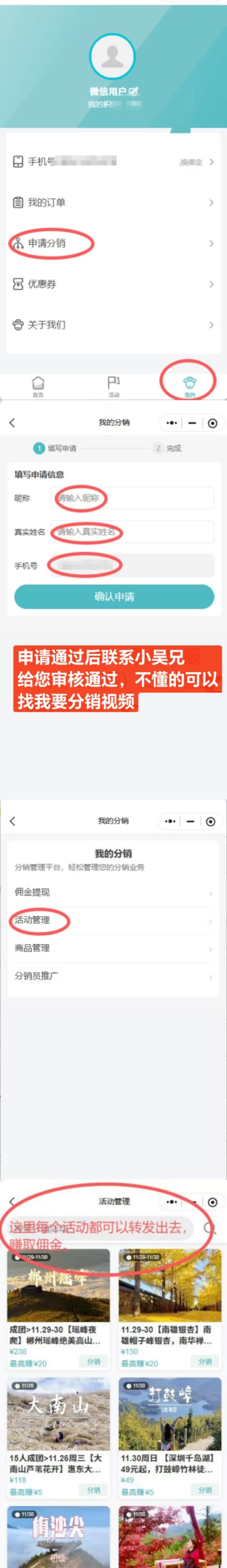 只要没有被其他分销员锁粉的小程序用户,通过上面第三步的方式点进去下单,都会被永久锁粉,后续不管TA从任何渠道进入报春户外旅行小程序报名,你都有佣金(永久)。